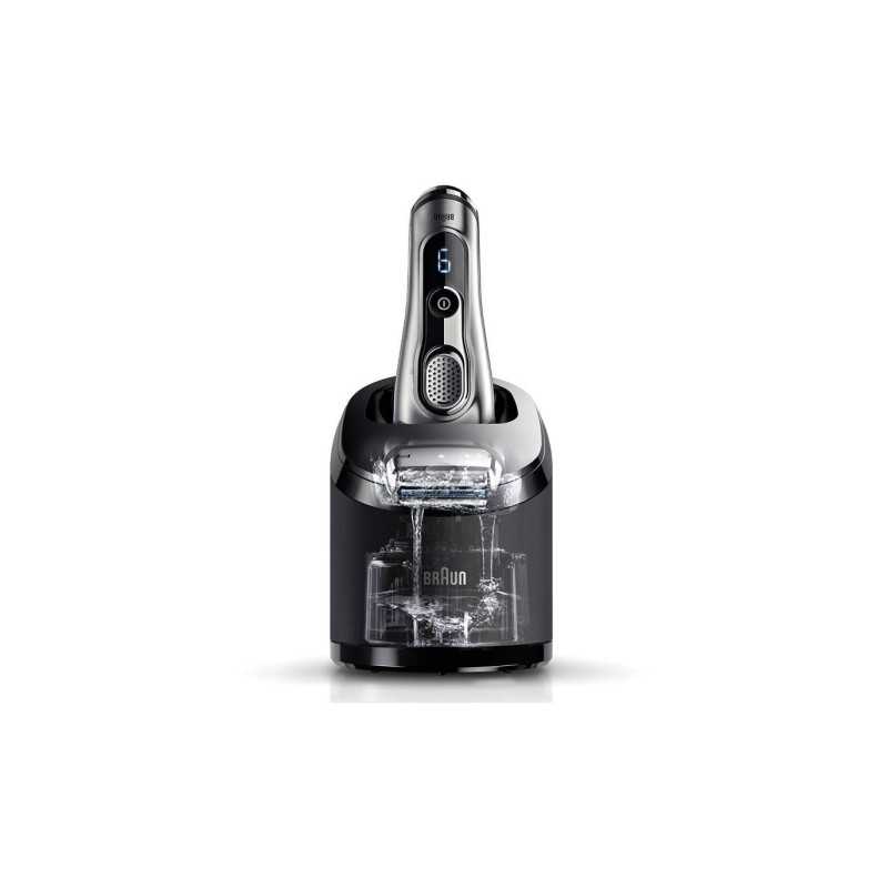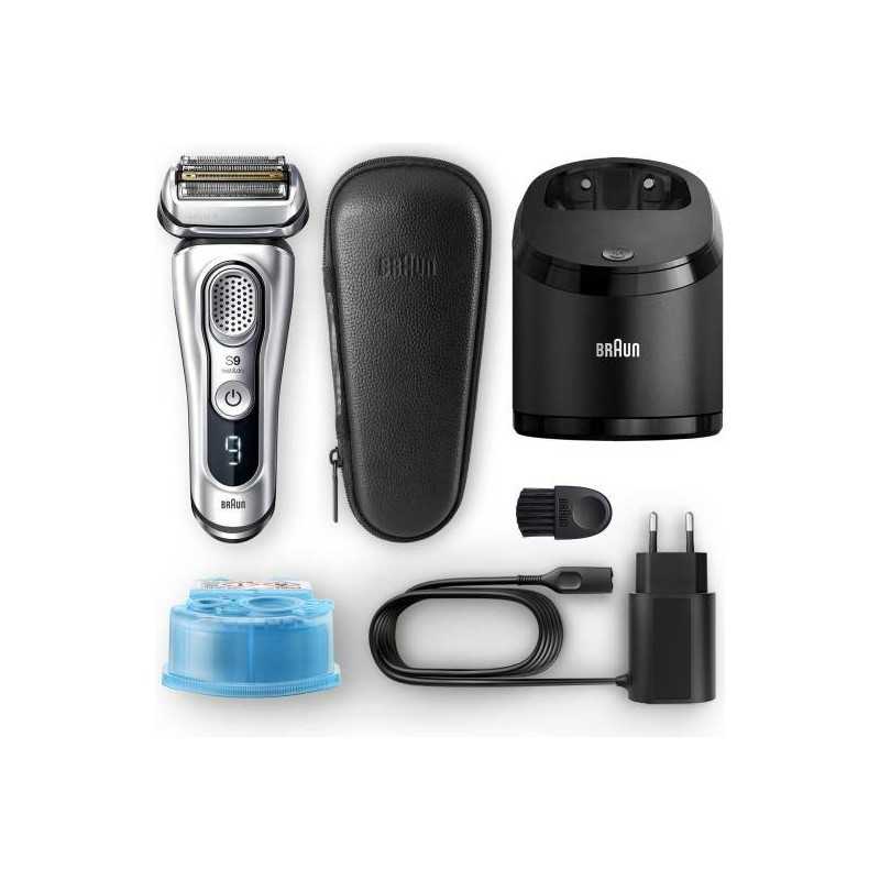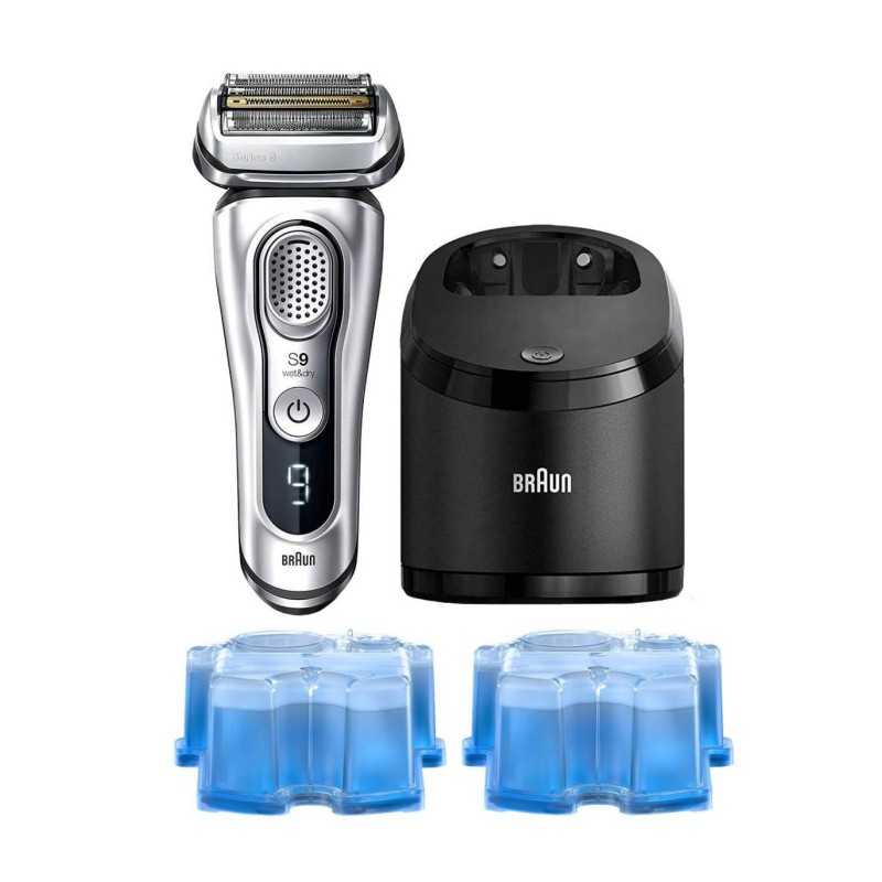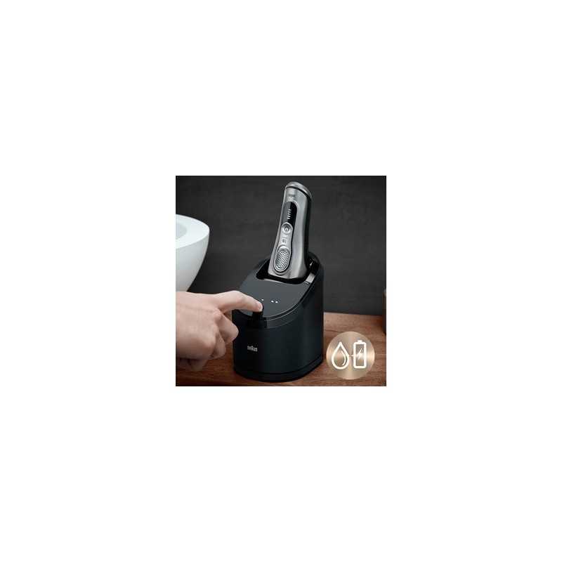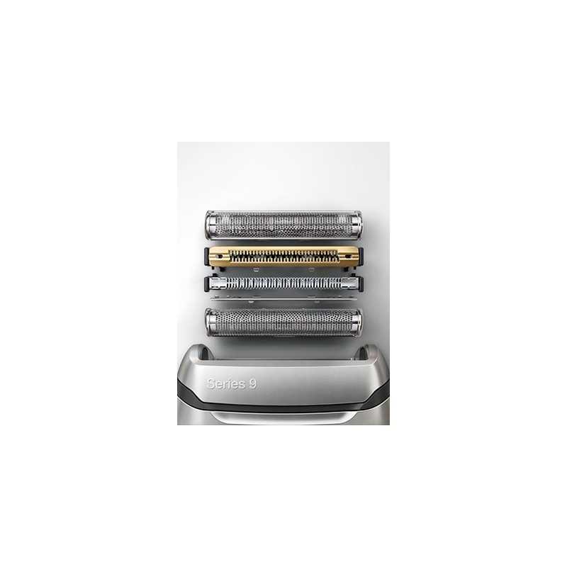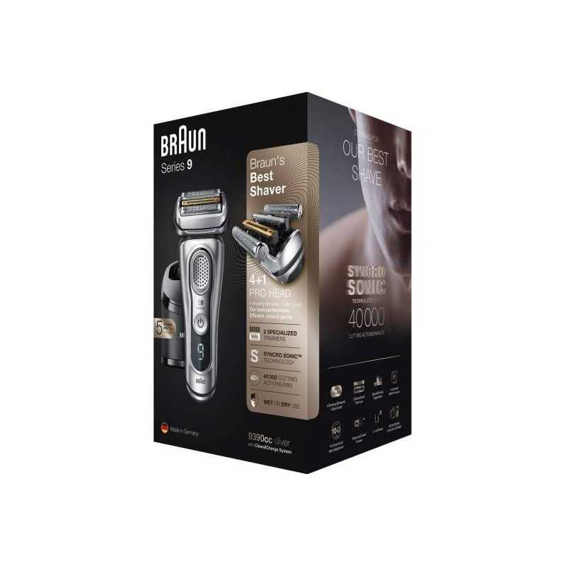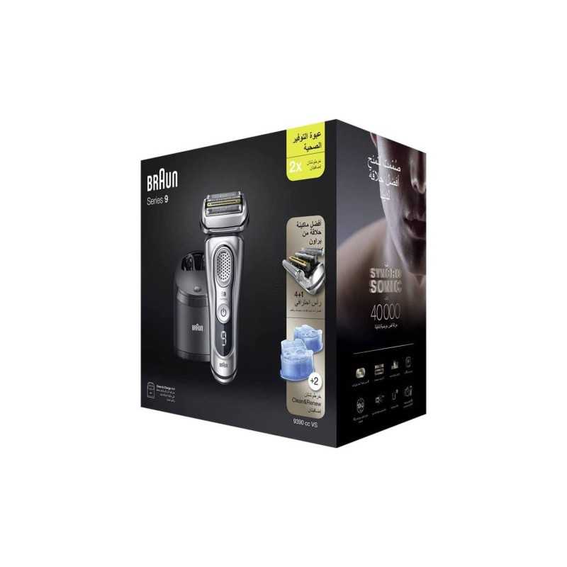 ماشین اصلاح صورت فویلی براون سری 9 Braun 9390cc VS Series 9 Foil Shaver ساخت آلمان است و از کیفیت بالایی برخوردار می باشد و دارای 20 درصد باتری بیشتر نسبت به سایر مدل های سری 9 است.این ریش تراش براون مجهز به سنسور تشخیص تراکم مو برای افزایش یا کاهش قدرت موتور است و قابلیت تغییر زاویه را به وسیله ی پردازنده 32 بیتی تا 4 برابر اصلاح نرم تر نسبت به سایر موارد را دارد و گزینه ای مناسب برای انواع پوست و بخصوص پوست های حساس است.تکنولوژی Syncro Sonic با قابلیت اصلاح 40 هزار مو در هر دقیقه را دارد.درون جعبه دو محلول شستشو نیز قرار داده شده تا همیشه اصلاحی بهداشتی و تمیز داشته باشید.