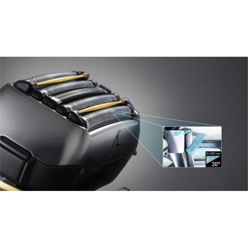 ریش تراش پاناسونیک سری Lamdash مدل ES-LV9Q ریشتراشی پنجتیغه و ضدآب با پایهی تمیزکنندهی اتوماتیک است. این مدل در بین سری ARC این شرکت به قرار دارد که تیغههایی منحصربهفرد دارند. این تیغهها دارای لبهای با زاویهی بهینهی ۳۰ درجه هستند و موها را از نزدیکترین نقطهی ممکن به پوست قطع میکنند؛ علاوهبراین، تیغهها توسط فناوری نانو پولیش شدهاند تا نهایت دقت و تیزبودن را ارائه دهند و به مدت طولانیتری، برندگی خود را حفظ کنند. روی تیغهها توسط پنج پوشش از جنس استیل ضدزنگ پوشانده شده است که هر کدام طراحی مخصوص به خود را دارند. چهار عدد از پوششها از نوع فویلی هستند و با طراحی ششضلعی و لبههای با زاویهی خاص، همهی موها حتی موهای خوابیدهی زیر گردن را بلند کرده و سپس به کمک تیغههای زیری قطع میکنند.