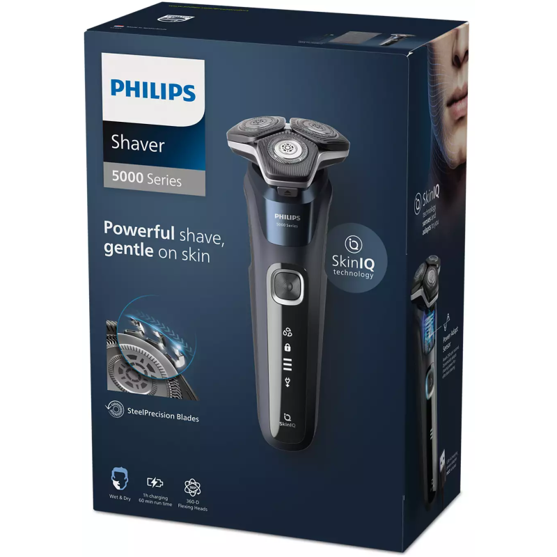 شما با خرید و انتخاب ریش تراش 5885/10 از سری 5000 فیلیپس اصلاحی بسیار قوی و در عین حال ملایم را بر روی پوست صورت خود خواهید داشت. این دستگاه شامل سه سری گرد بوده که با برخورداری از 45 تیغه استیل ضد زنگ خود تیز شونده به راحتی می تواند 9000 برش در دقیقه را انجام دهد که این قابلیت باعث تسریع در زمان اصلاح شما خواهد شد. این ریش تراش دارای تکنولوژی مدرن سنسور هوشمند SkinlQ است که این سنسور با حرکت دستگاه بر روی صورت با تشخیص هوشمند میزان تراکم ریش را با میزان 125 بار در ثانیه، قدرت موتور به طور خودکار جهت انجام فرآیند اصلاحی دقیق تر تنظیم می شود.